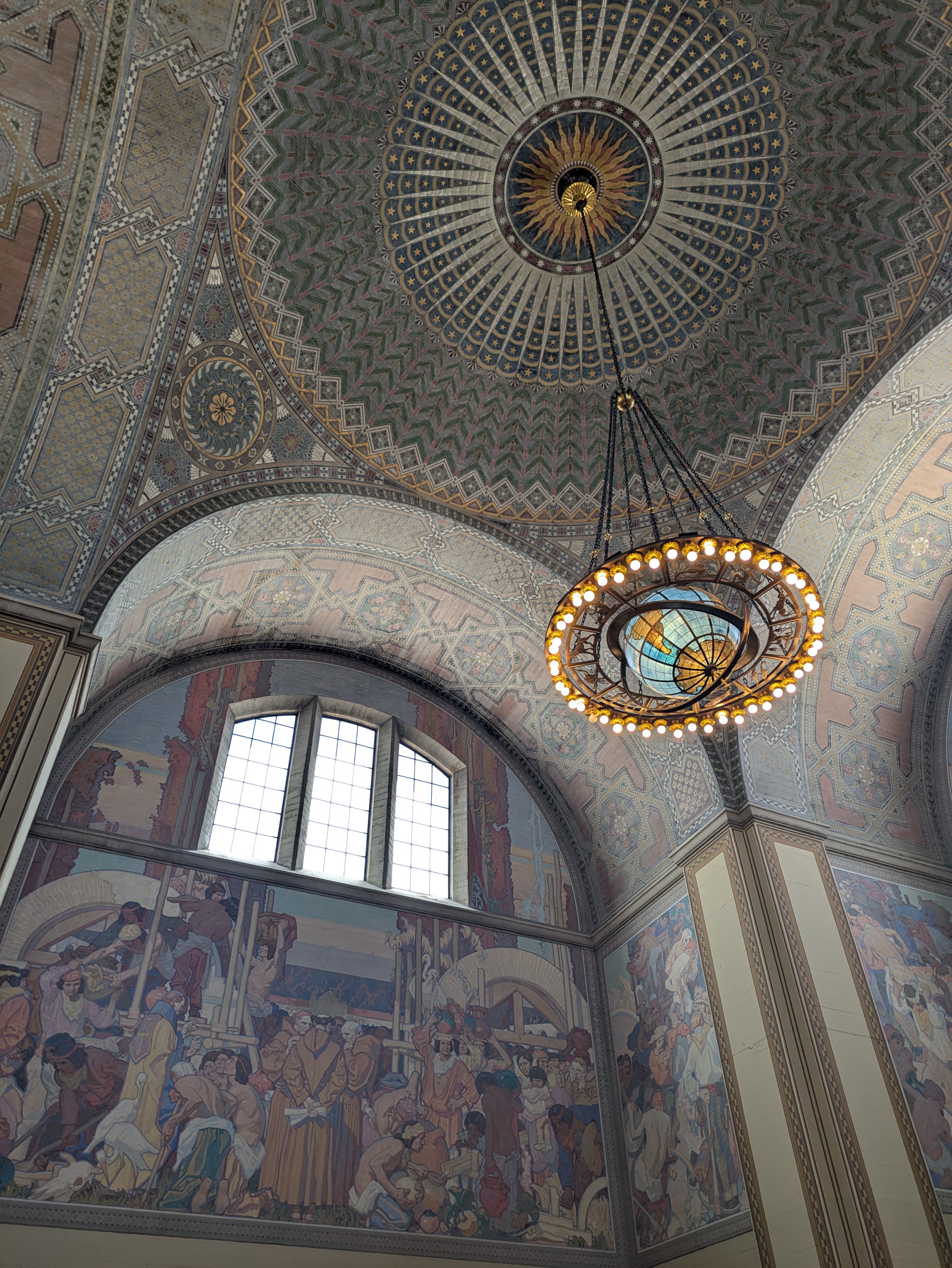Following the theme of light and learning, the centerpiece of the rotunda is a monumental chandelier, sporting an illuminated globe of the Earth surrounded by a ring of forty-eight lightbulbs and bronze representations of the zodiac signs. Coupled with the sun and stars inlaid into the top of the ceiling nearly a hundred feet above you, the whole thing is meant to represent the solar system.