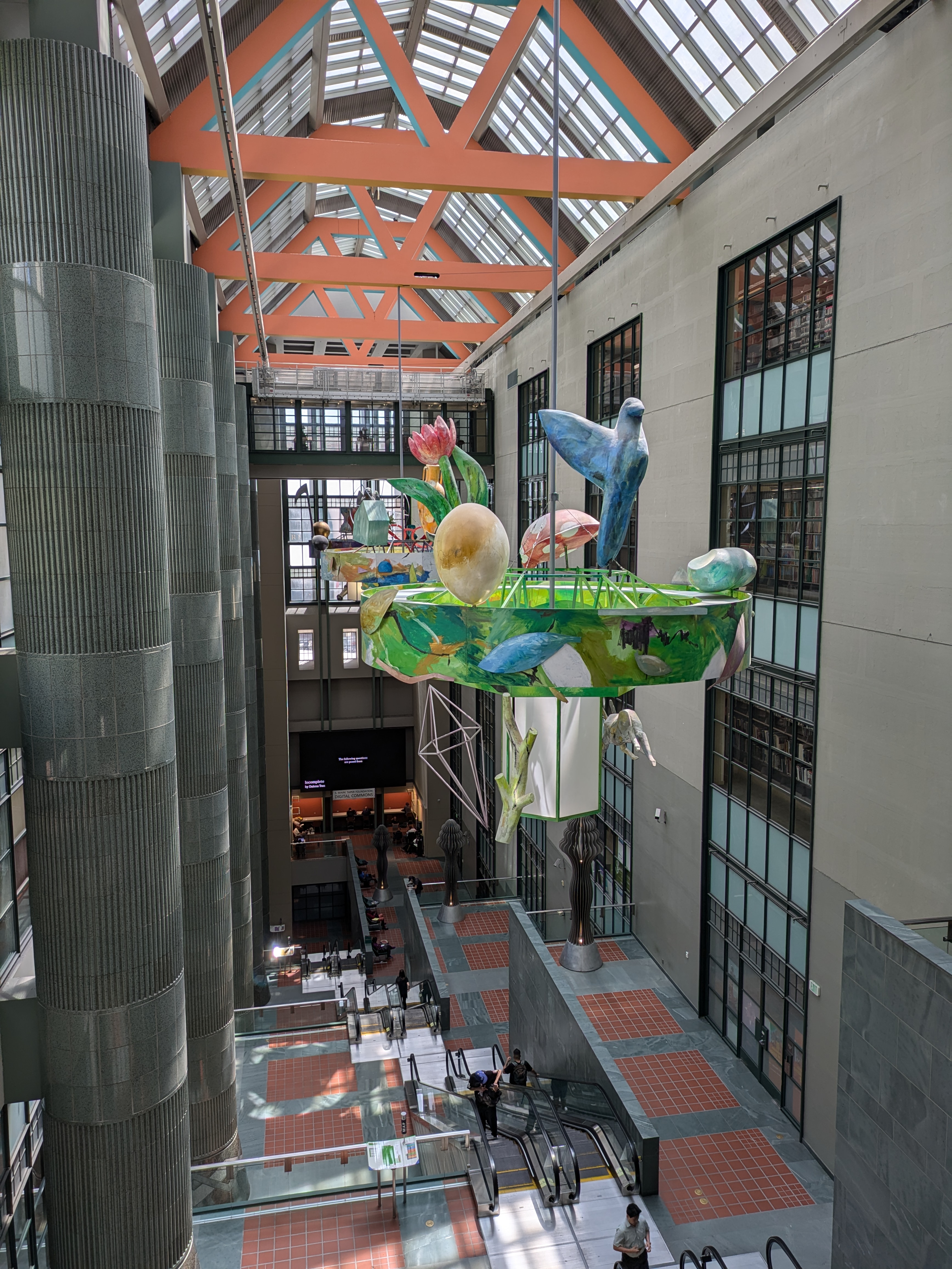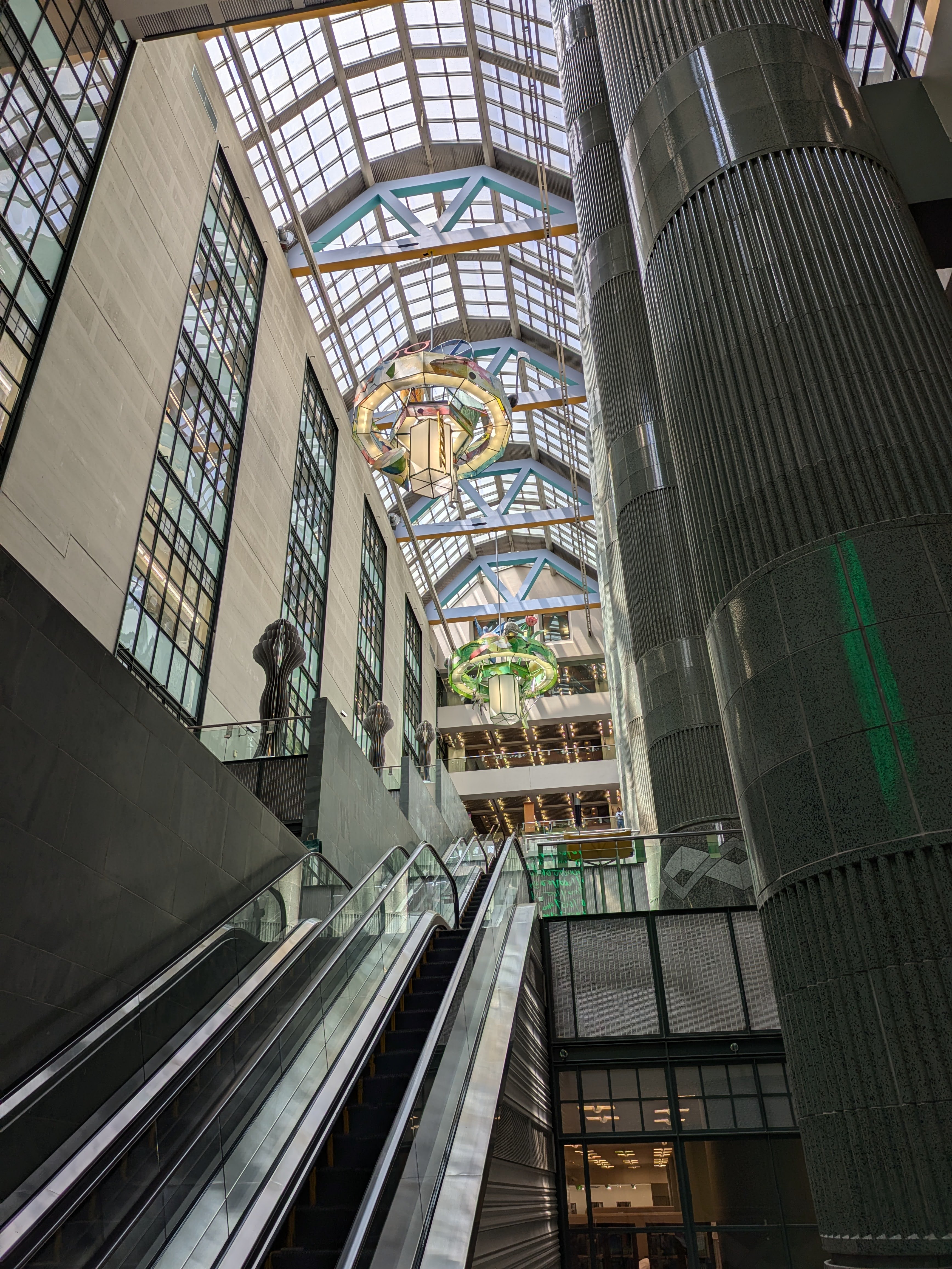 Descending the escalators to the bottom of the Atrium, you can admire the sheer scale of the space, with massive green terra cotta pillars and curvilinear lanterns designed by Ann Preston that fit the subdued tones of the room.