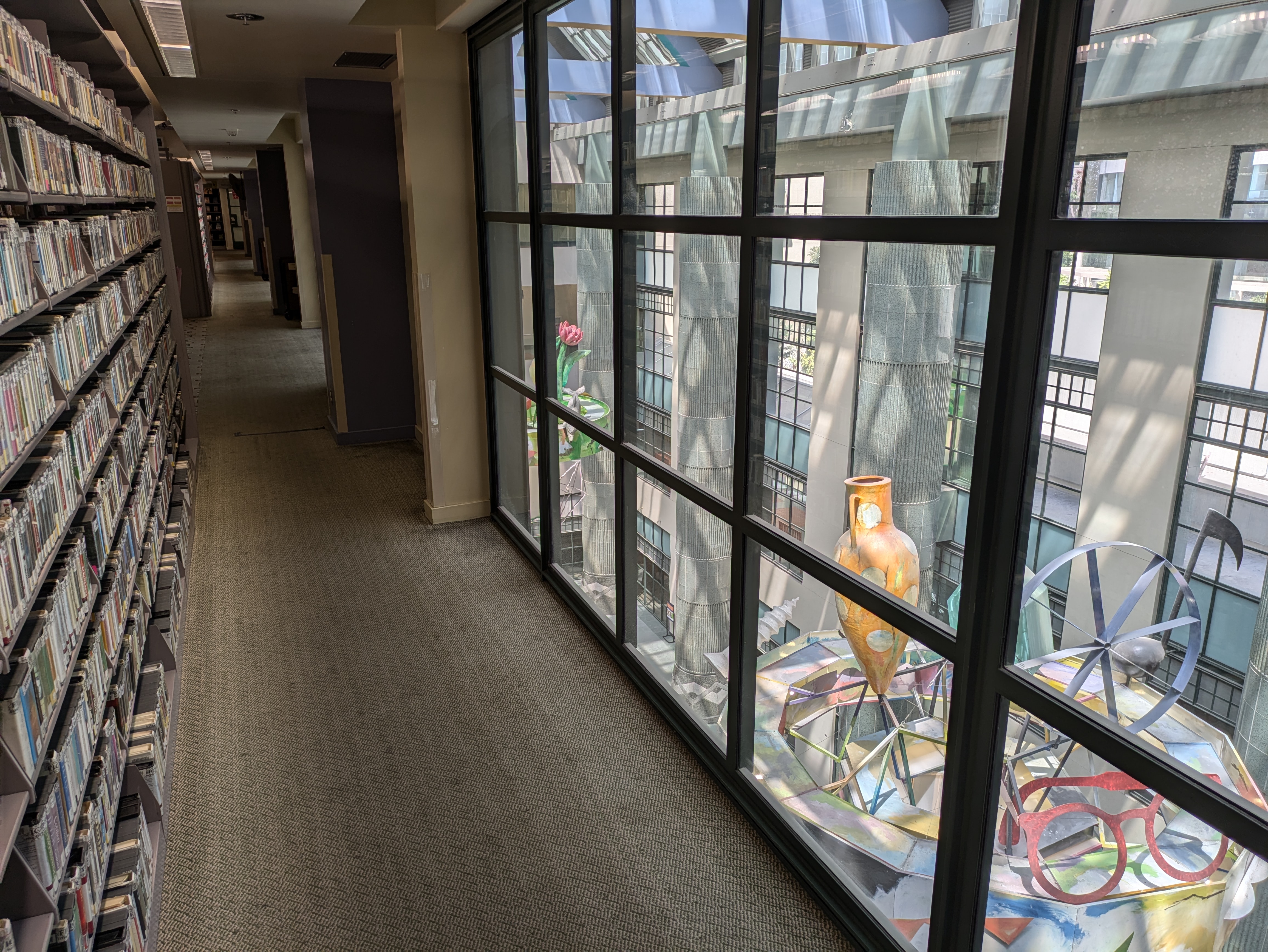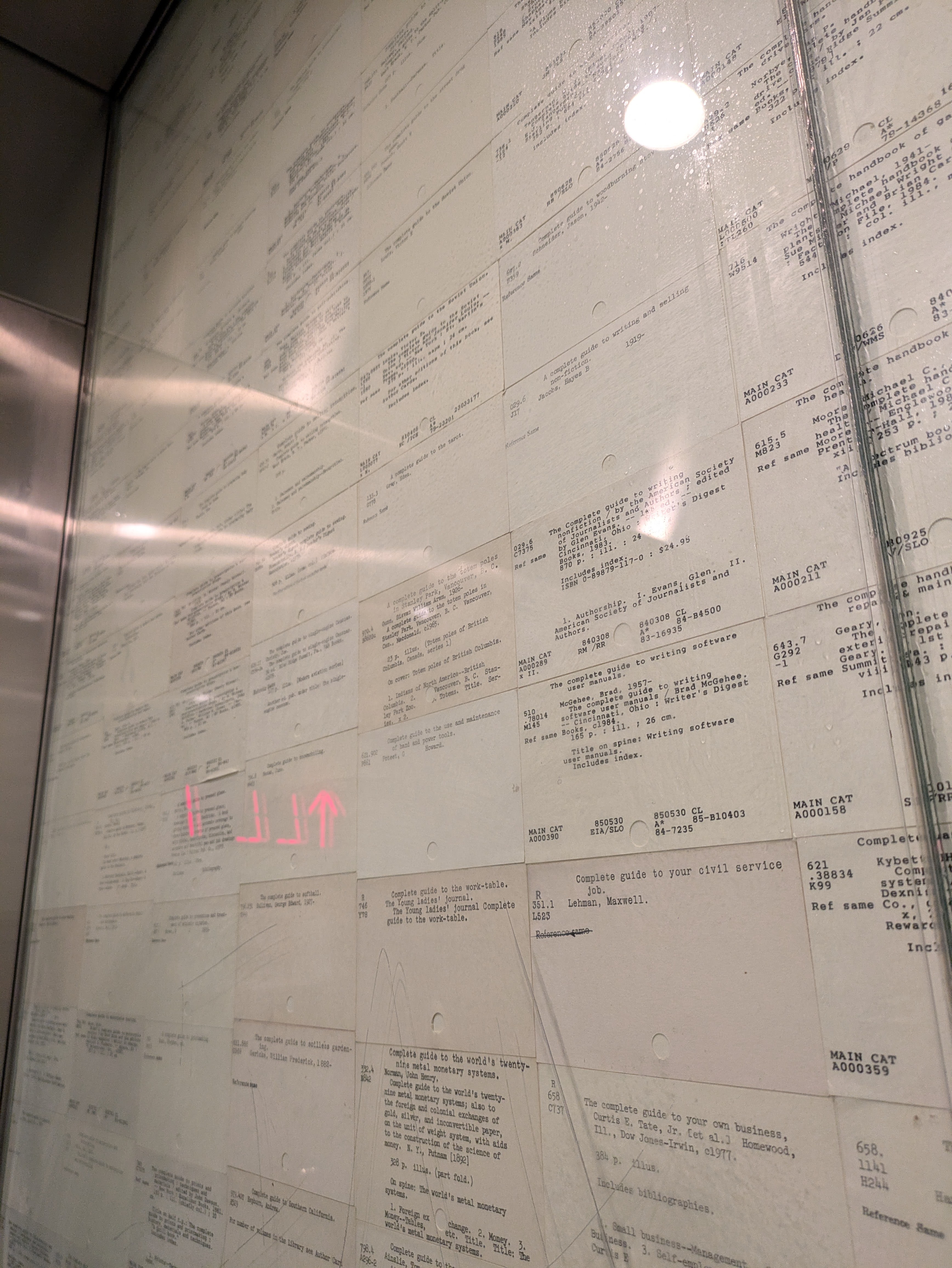 A great and (somewhat) hidden feature of the wing is in the elevators. During the renovation, artist David Bunn got his hands on the old index card catalog for Central Library. With it, he created A Place for Everything and Everything in its Place, with index cards lining the walls of each elevator cab, as well as the elevator shafts. As you ride the elevator, you can look over the titles of some of the many books belonging to the library, which also reference the sections served by the elevators.