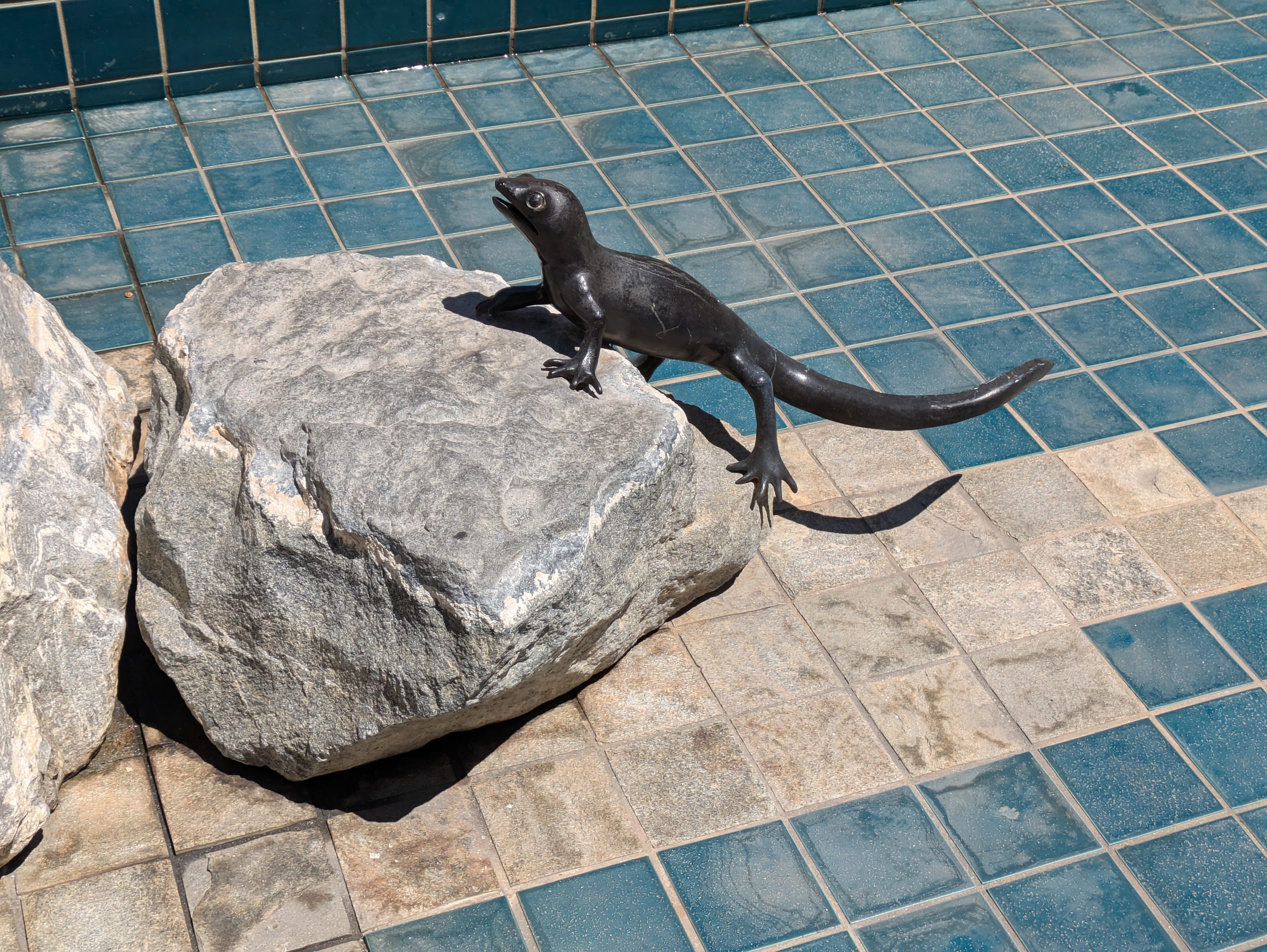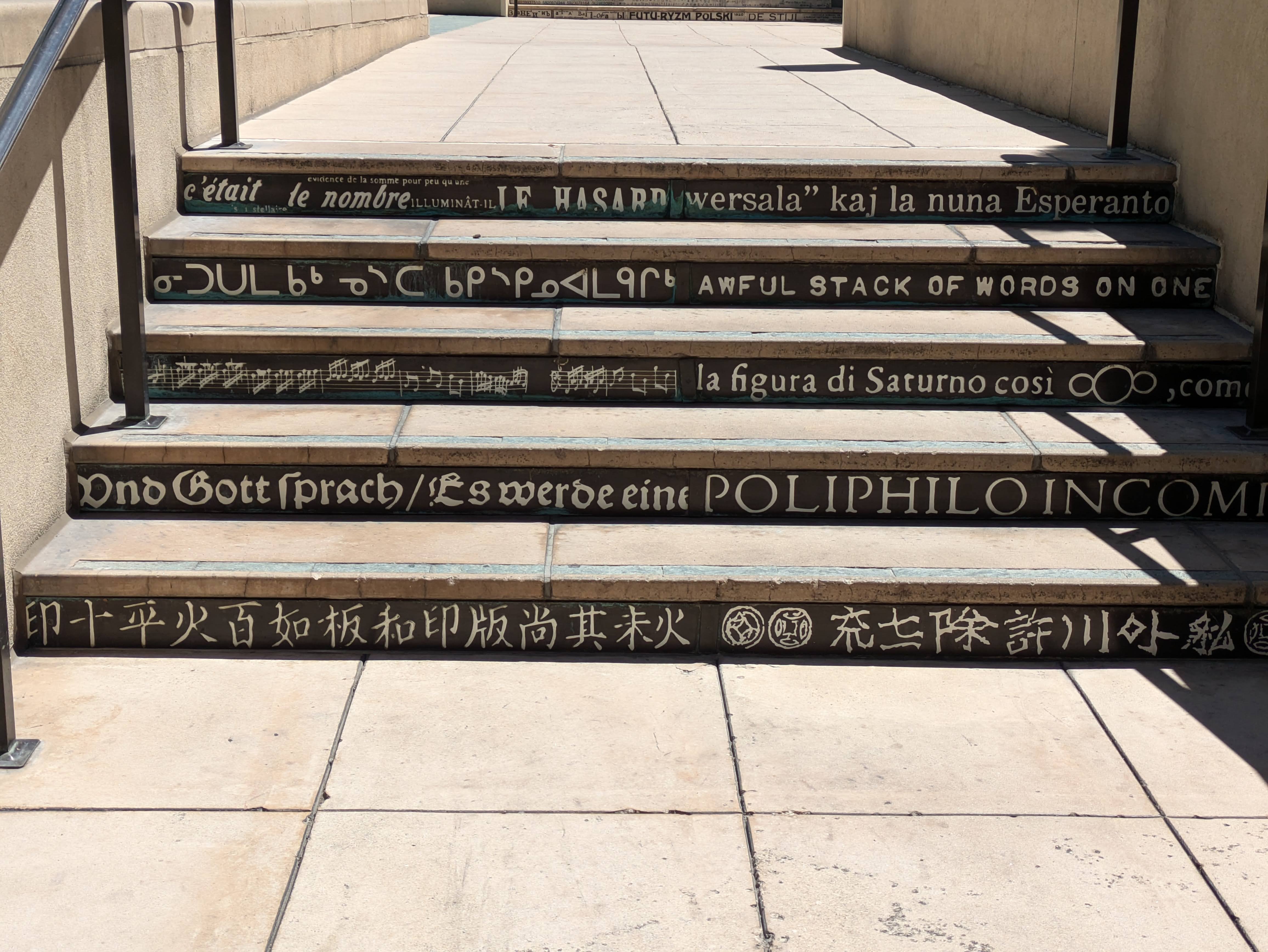 The centerpiece of the gardens is Jud Fine’s Spine, a complex artwork that lines the tiered fountain, which has lacked water for many years now as a water-saving measure. The theme of the work is evolution, tracing the development both of natural life and human knowledge. The bottom pool contains a replica of a skeleton of a labryrinthodont, an ancient amphibian, which looks like it came directly from a natural history museum. The middle pool holds a bronze sculpture of a newt, while the top pool has a sculpture of a peregrine falcon taking flight. All around the fountain and inlaid into the steps are various words and pictographs representing the development of the written word. It’s marvelous stuff, and takes some careful scrutiny to take it all in.