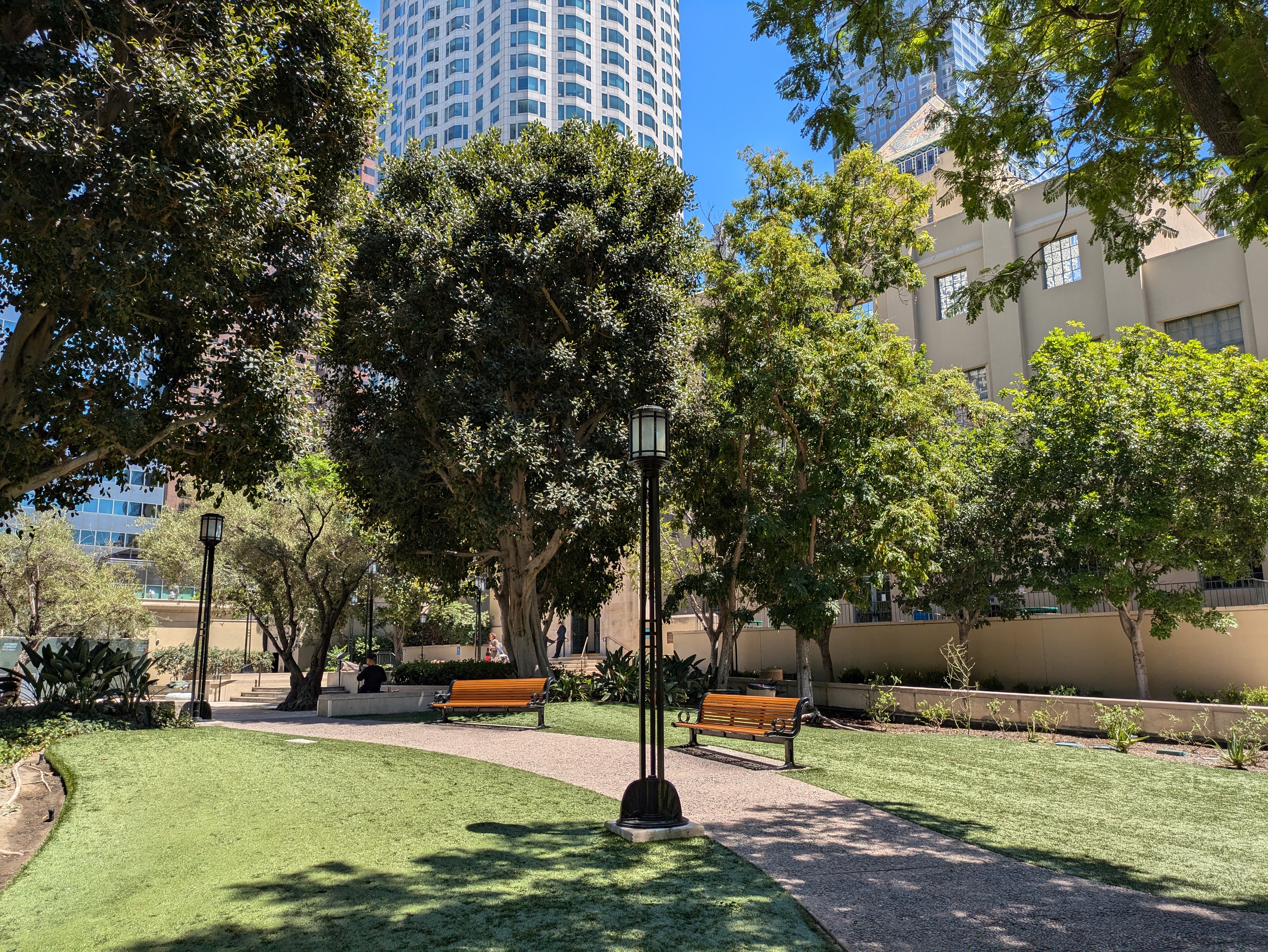 When it opened in 1926, Central Library had a lawn on its west side, facing the corner of 5th and Flower, but this was paved over in 1969 for a parking lot. When the library was renovated and expanded in the early ’90s, the parking lot was replaced with an underground garage, providing the opportunity to restore the green space that had been lost. A lush square of shady trees now sits on the space, with a curving path under the trees and an iconic tiered entryway leading up to the west entrance.