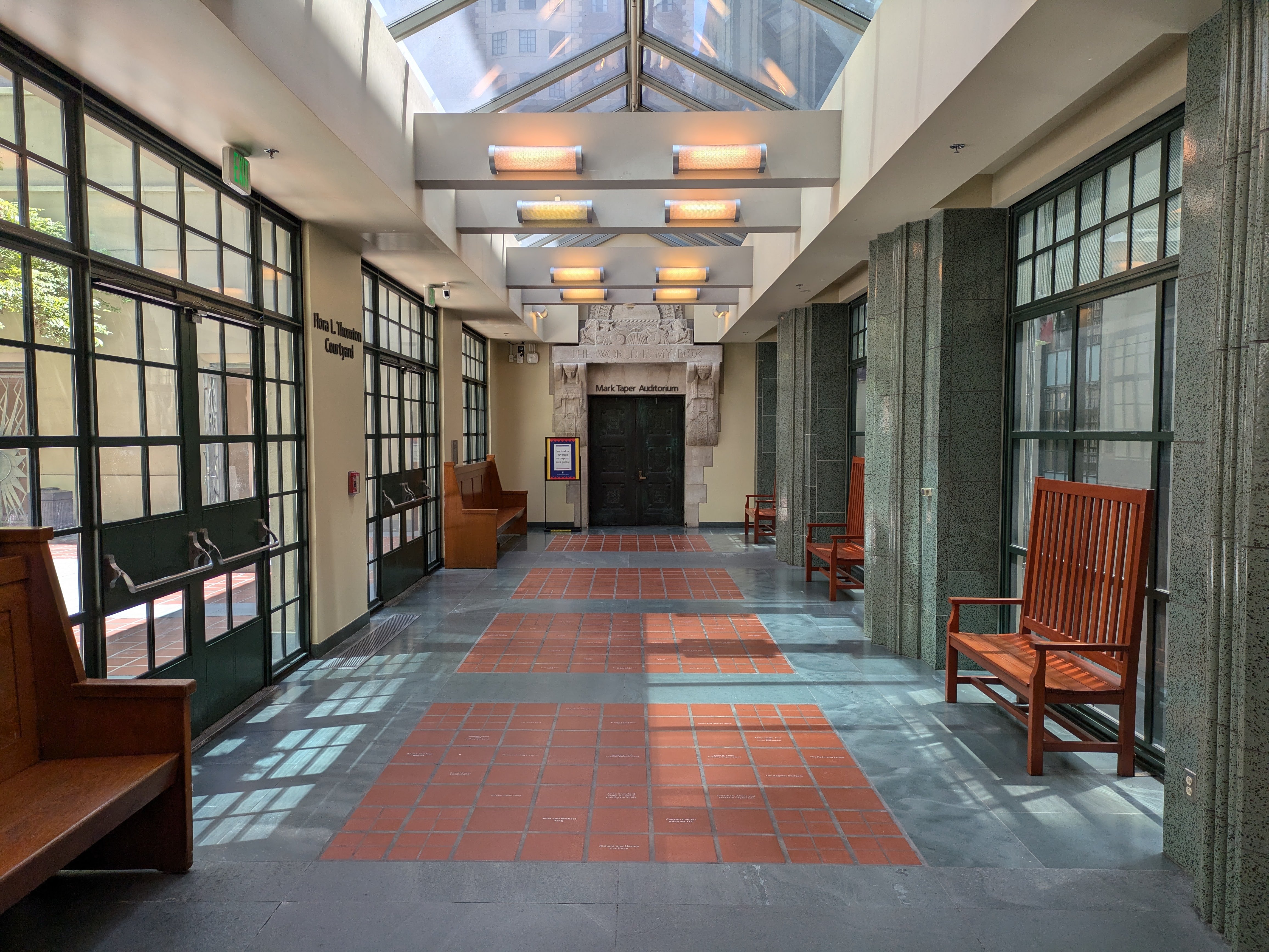 Another feature of the wing is the Mark Taper Auditorium, tucked into a corner of the 1st Floor, which hosts lectures, shows, and various events. The auditorium itself isn’t much to speak of, but the entrance to the auditorium is adorned with the sculpture that was originally above the eastern entrance to the original building, which was demolished to make way for the new wing.